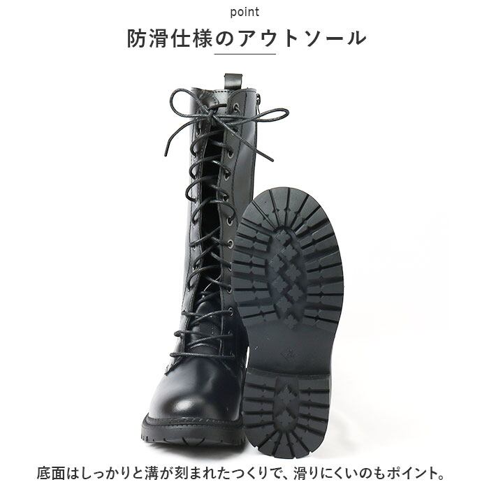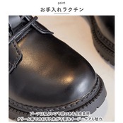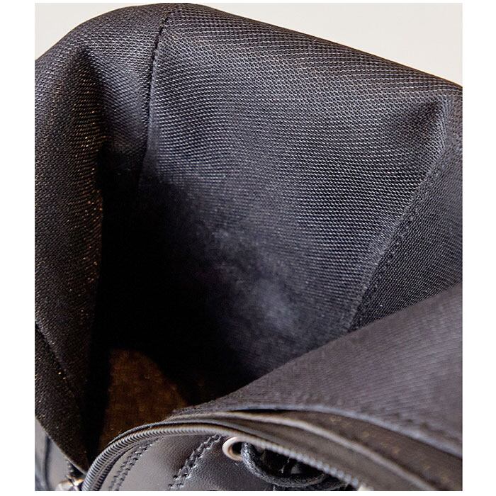・ブーツは程よいツヤ感のある合皮素材。クリーム等でのお手入れが不要なイージーケアも魅力。