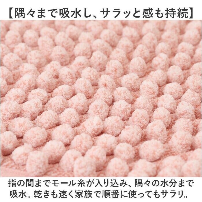 ・指の間までモール糸が入り込み、隅々の水分まで吸水。乾きも速く家族で順番に使ってもサラリ。