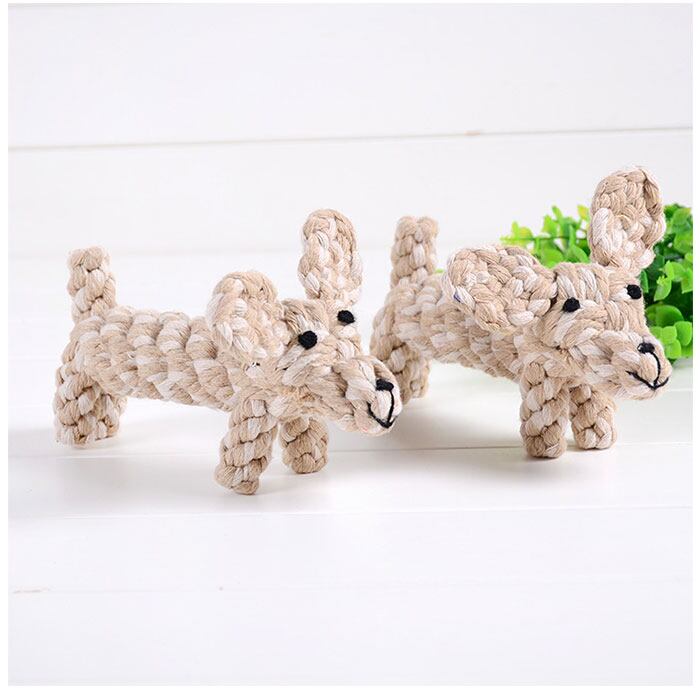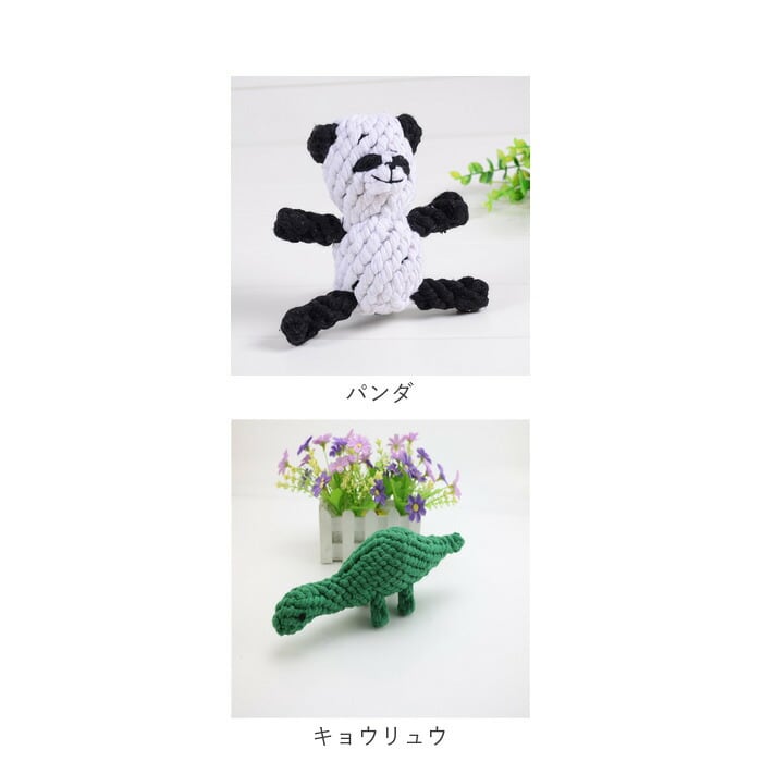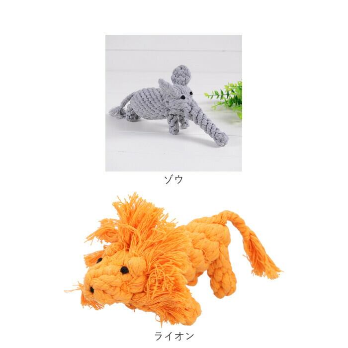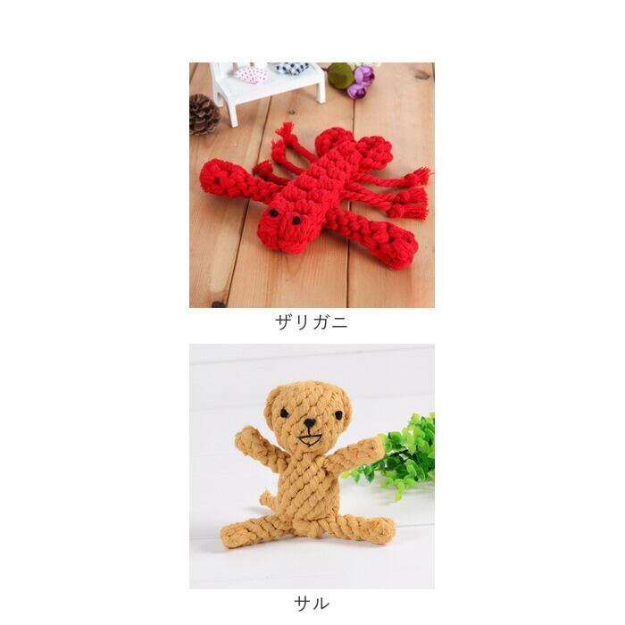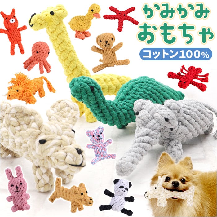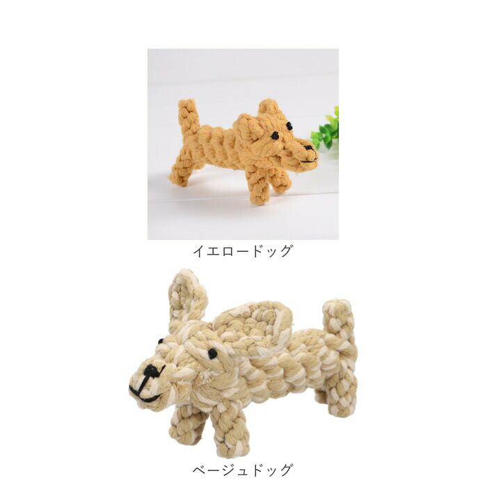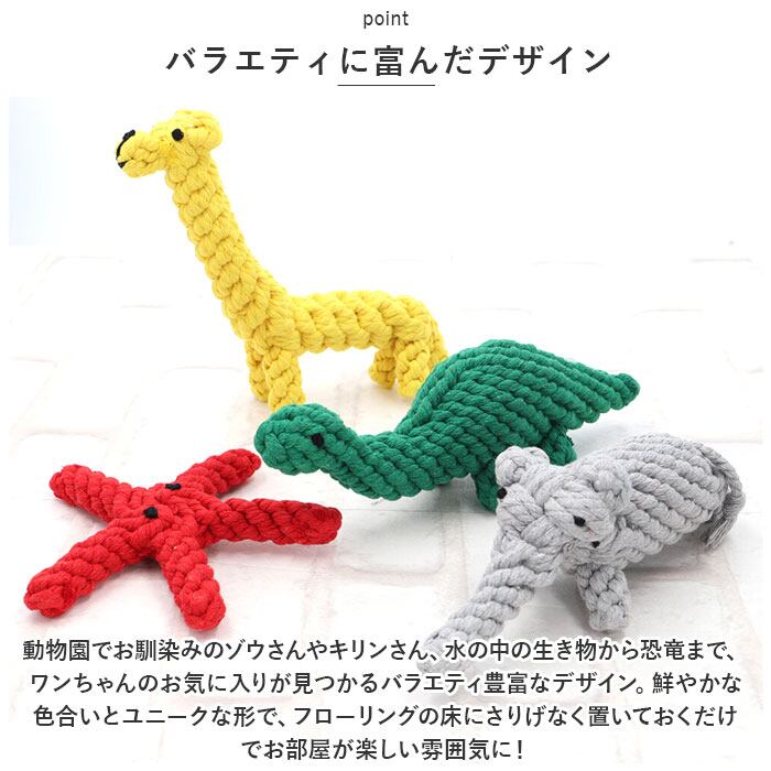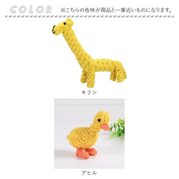 ・カラフルなコットンのロープを、ウサギさんやアヒルさんなど、可愛らしいアニマルの形に編み込んで仕上げたドッグ用ロープトイ。素朴な雰囲気と優しい噛み応えにワンちゃん夢中。