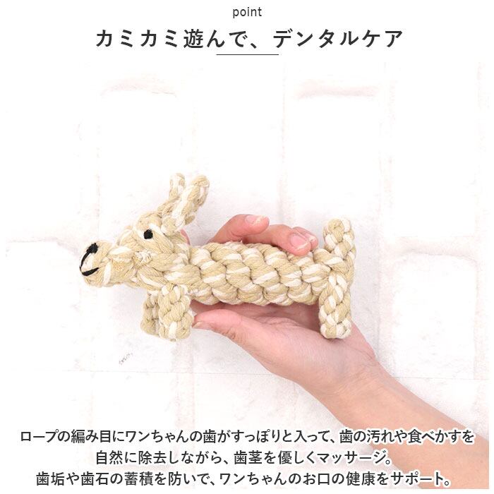 ・ロープの編み目にワンちゃんの歯がすっぽりと入って、歯の汚れや食べかすを自然に除去しながら、歯茎を優しくマッサージ。歯垢や歯石の蓄積を防いで、ワンちゃんのお口の健康をサポート。