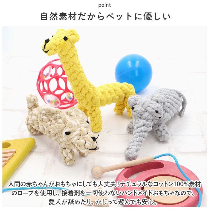 ・人間の赤ちゃんがおもちゃにしても大丈夫!ナチュラルなコットン100%素材のロープを使用し、接着剤を一切使わないハンドメイドおもちゃなので、愛犬が舐めたり、かじって遊んでも安心。