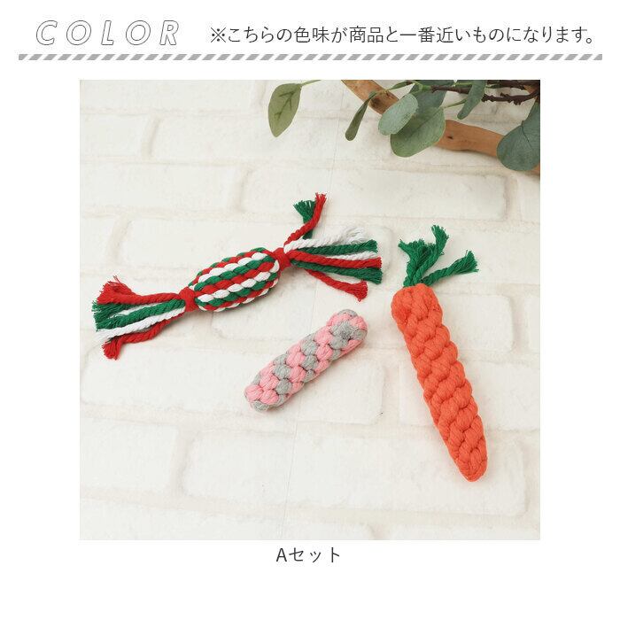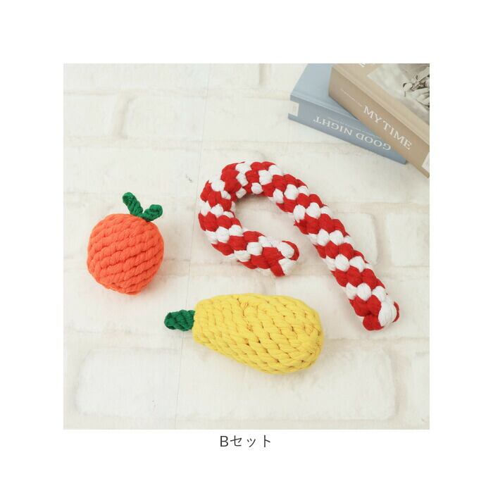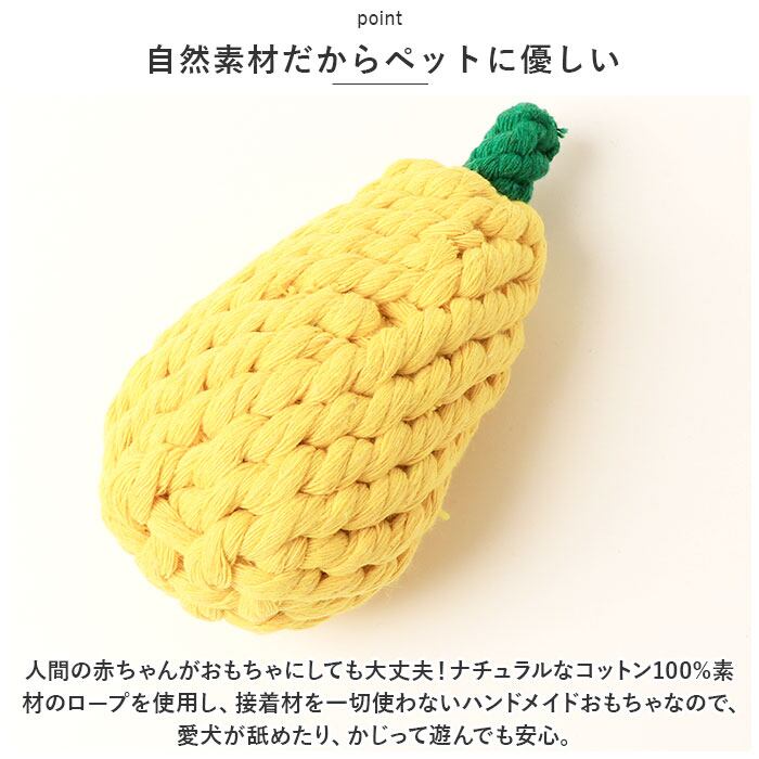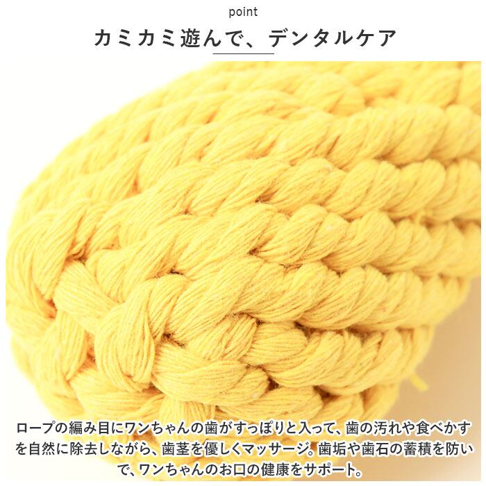 ・カラフルなコットンのロープを、ベジタブルやフルーツ、ワンちゃんのお気に入りのフードの形に編み込んで仕上げたドッグ用ロープトイ。素朴な雰囲気と優しい噛み応えにワンちゃん夢中。