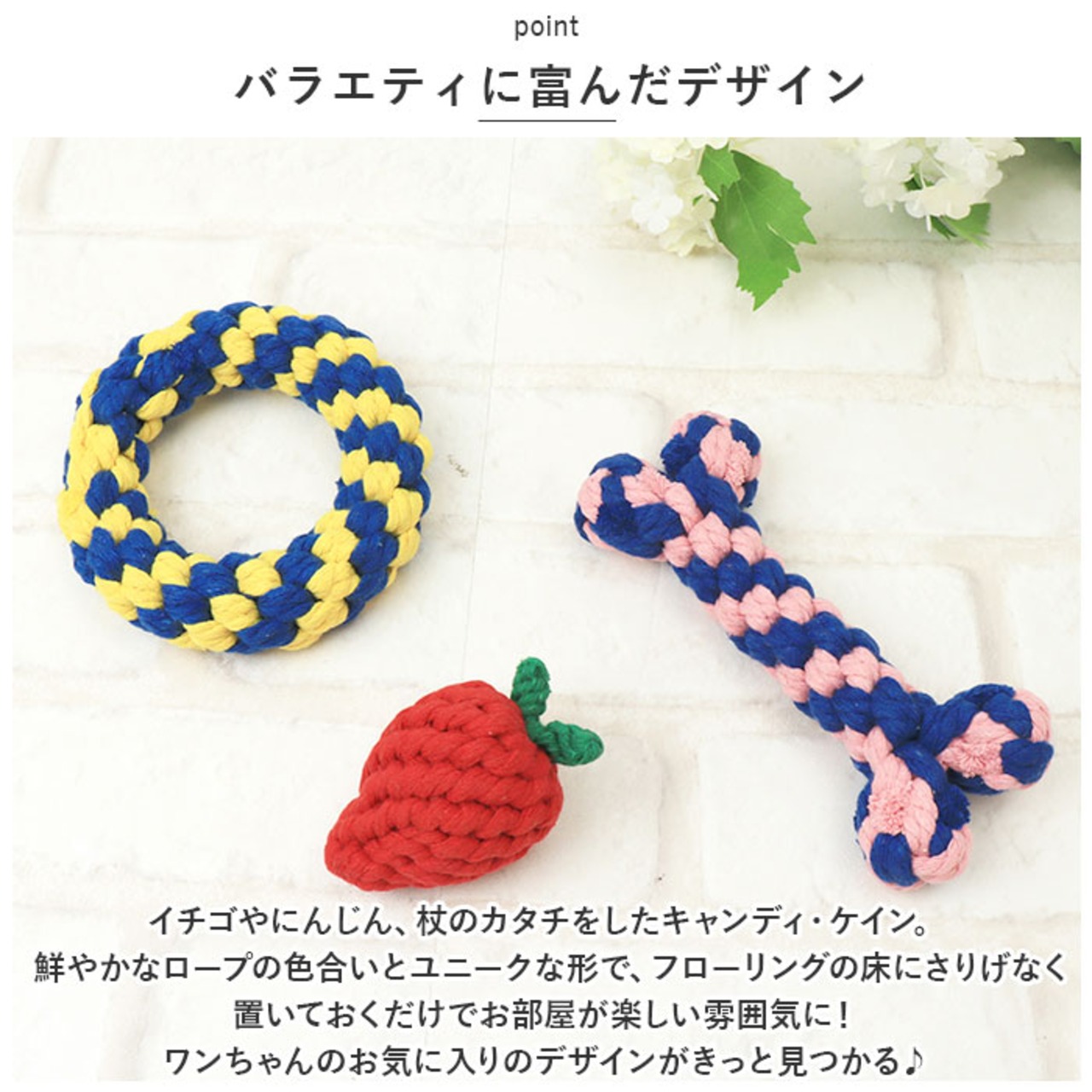 ・イチゴやにんじん、杖のカタチをしたキャンディ・ケイン。鮮やかなロープの色合いとユニークな形で、フローリングの床にさりげなく置いておくだけでお部屋が楽しい雰囲気に!ワンちゃんのお気に入りのデザインがきっと見つかる♪
