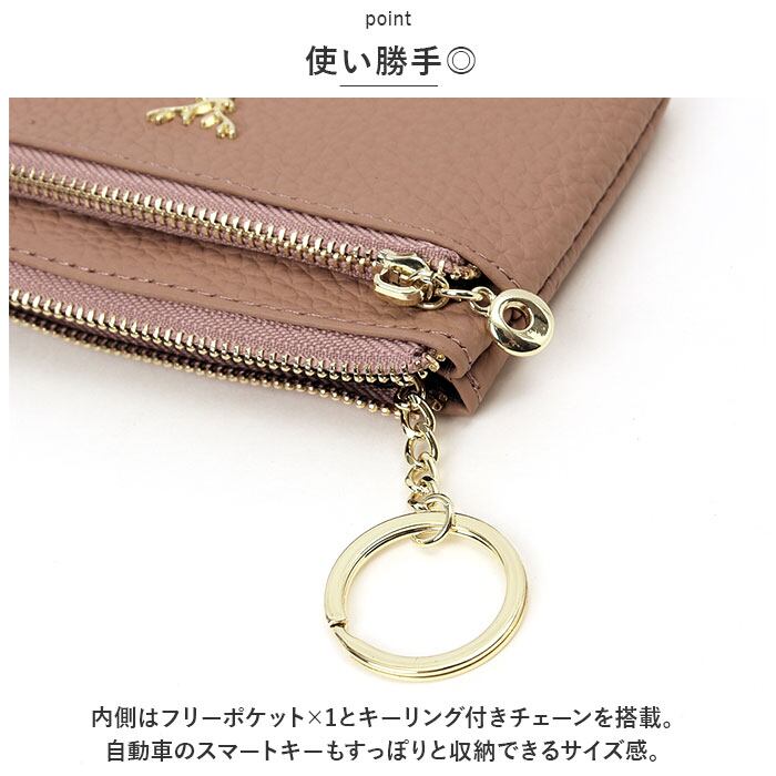 ・内側はフリーポケット×1とキーリング付きチェーンを搭載。自動車のスマートキーもすっぽりと収納できるサイズ感。