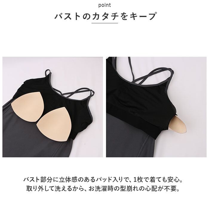 ・バスト部分に立体感のあるパッド入りで、1枚で着ても安心。取り外して洗えるから、お洗濯時の型崩れの心配が不要。