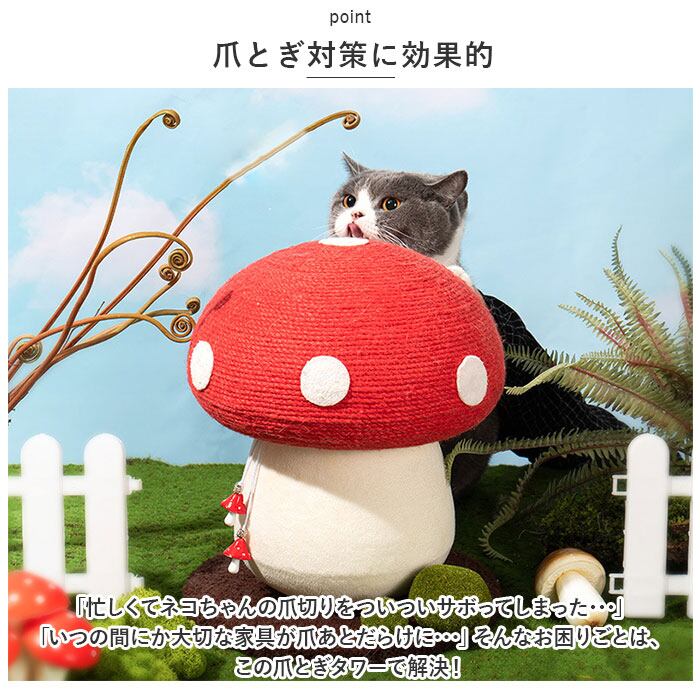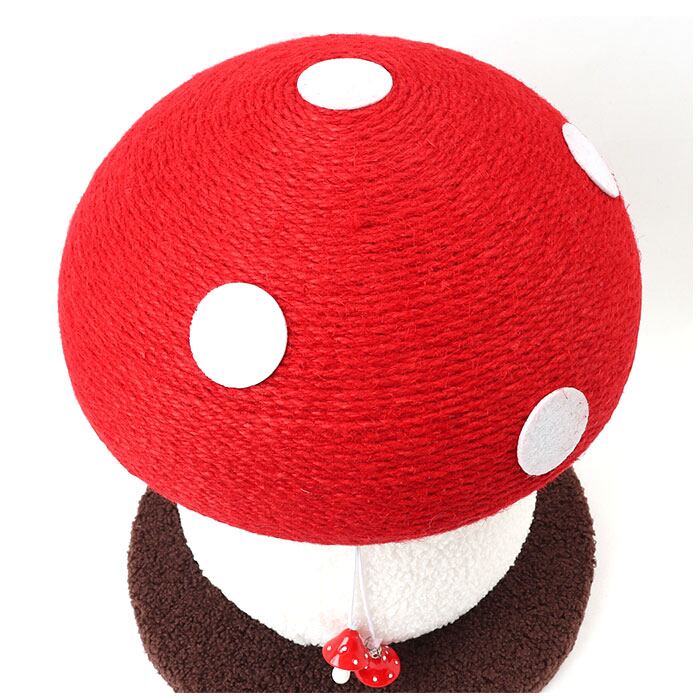 ・キノコの赤いカサの表面には天然の麻縄を全面に巻きつけ、爪のひっかかりがよく、ネコちゃんのストレス解消にぴったり。
