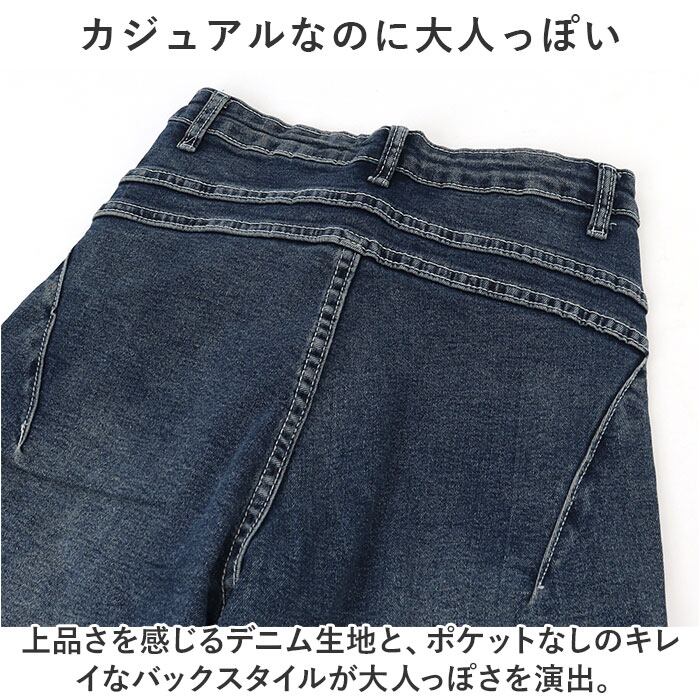 ・上品さを感じるデニム生地と、ポケットなしのキレイなバックスタイルが大人っぽさを演出。