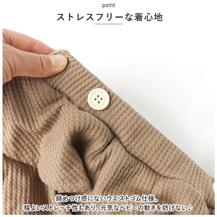 ・締めつけ感にないウエストゴム仕様。程よいストレッチ性もあり、元気なベビーの動きを妨げない♪