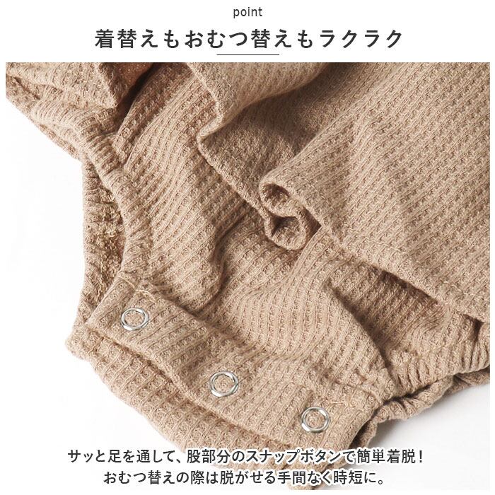 ・サッと足を通して、股部分のスナップボタンで簡単着脱!おむつ替えの際は脱がせる手間なく時短に。