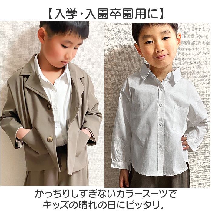 ・かっちりしすぎないカラースーツでキッズの晴れの日にピッタリ。