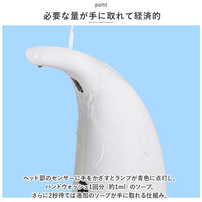 ・ヘッド部のセンサーに手をかざすとランプが青色に点灯し、ハンドウォッシュ1回分(約1ml)のソープ、さらに2秒待てば追加のソープが手に取れる仕組み。