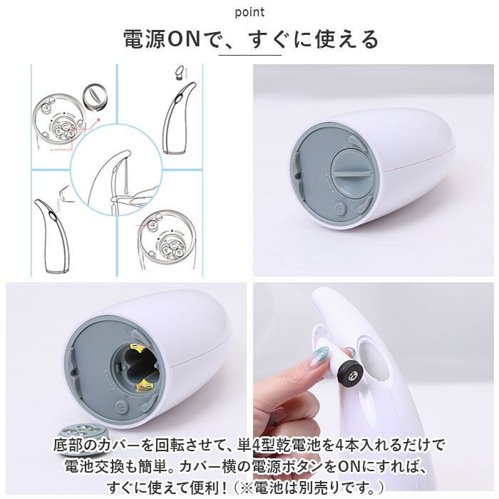 ・底部のカバーを回転させて、単4型乾電池を4本入れるだけで電池交換も簡単。カバー横の電源ボタンをONにすれば、すぐに使えて便利!(※電池は別売りです。)