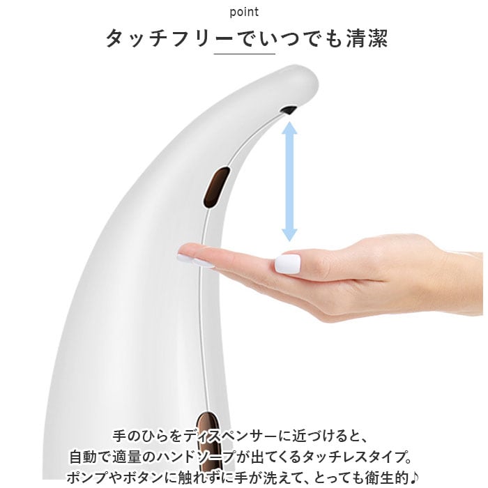 ・手のひらをディスペンサーに近づけると、自動で適量のハンドソープが出てくるタッチレスタイプ。ポンプやボタンに触れずに手が洗えて、とっても衛生的♪