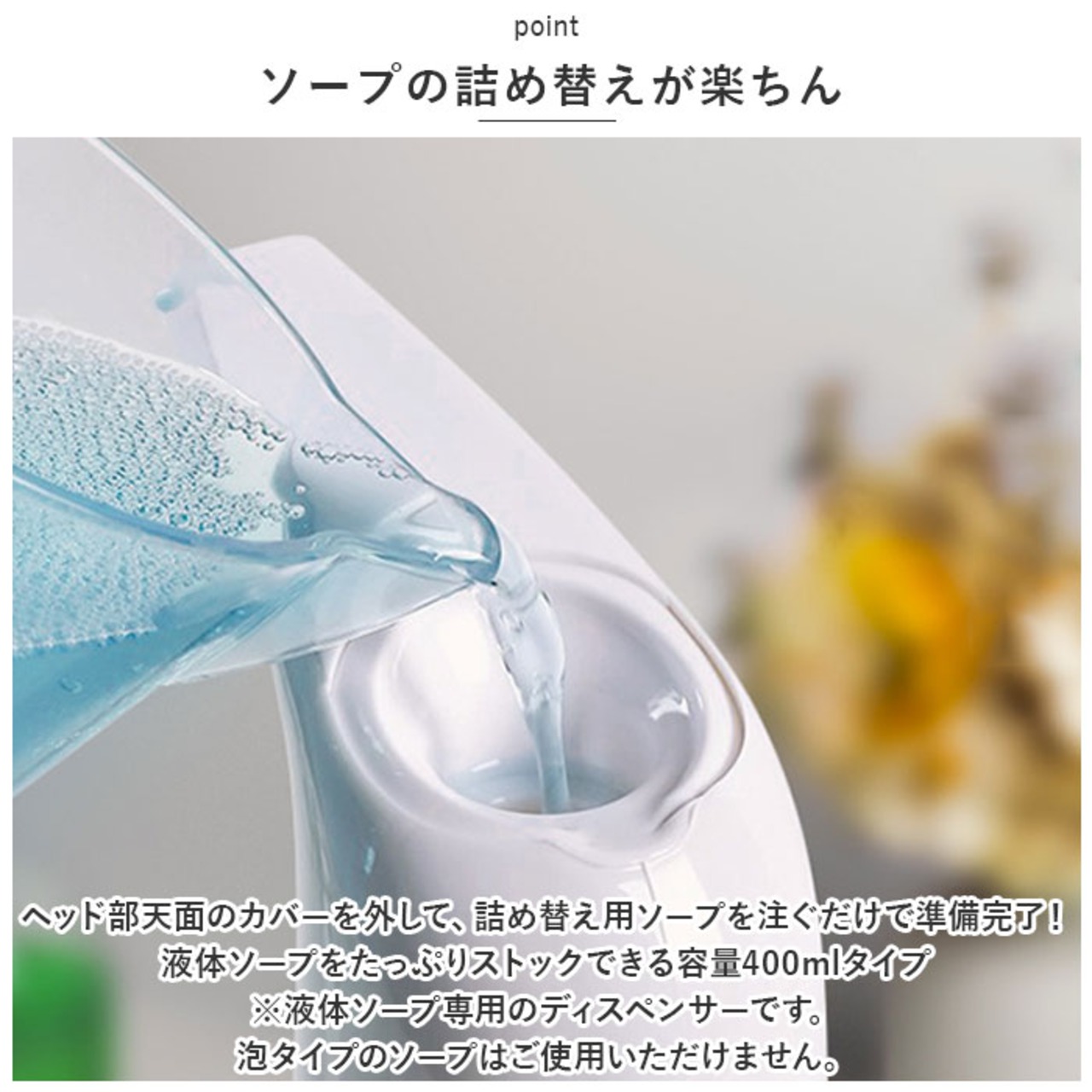 ・ヘッド部天面のカバーを外して、詰め替え用ソープを注ぐだけで準備完了!液体ソープをたっぷりストックできる容量400mlタイプ。(※液体ソープ専用のディスペンサーです。泡タイプのソープはご使用いただけません。)