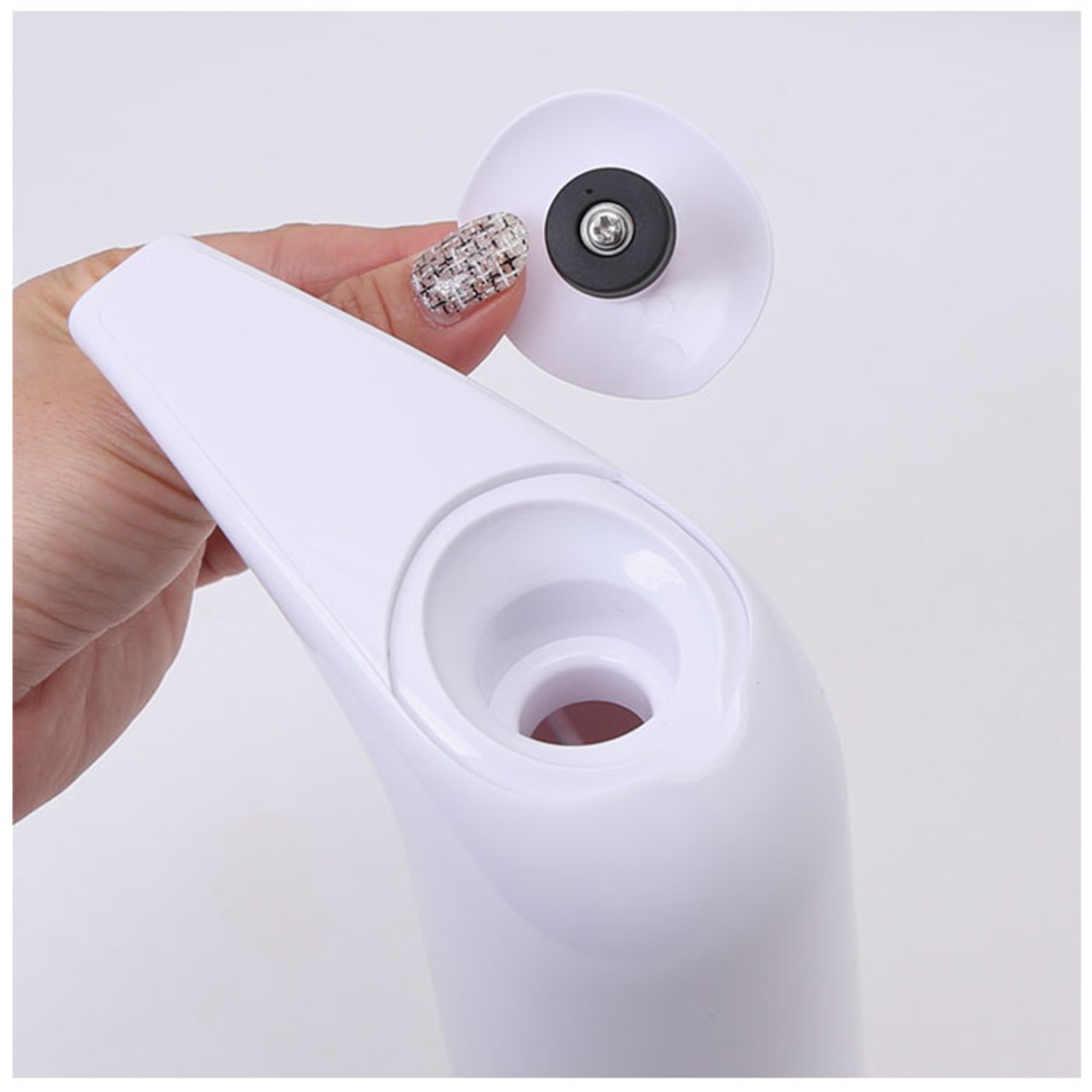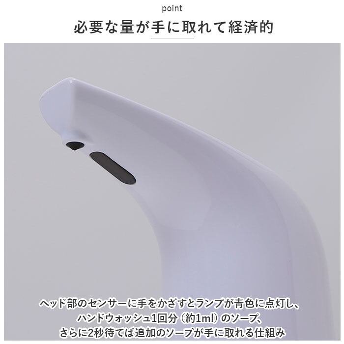・ヘッド部のセンサーに手をかざすとランプが青色に点灯し、ハンドウォッシュ1回分(約1ml)のソープ、さらに2秒待てば追加のソープが手に取れる仕組み。