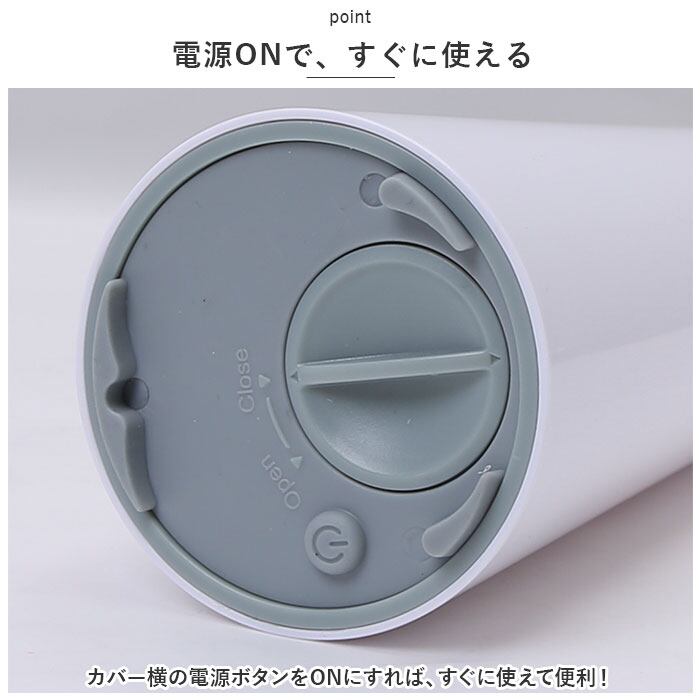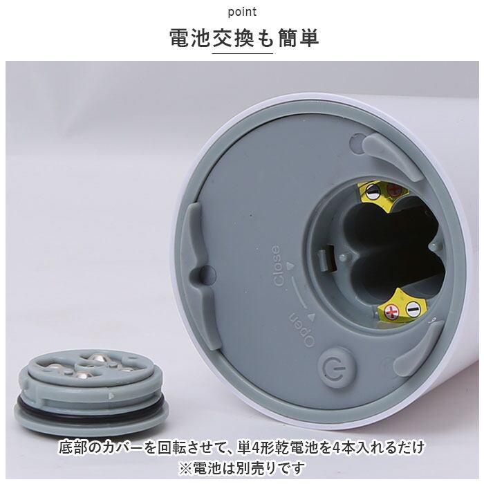 ・底部のカバーを回転させて、単4形乾電池を4本入れるだけで電池交換も簡単。カバー横の電源ボタンをONにすれば、すぐに使えて便利!(※電池は別売りです。)