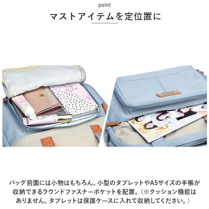 ・バッグ前面には、パスケースなどの小物はもちろん、小型のタブレットや手帳が収納できるラウンドファスナーポケットを配置。(※クッション機能はありません。保護ケースに入れてから収納してください。)