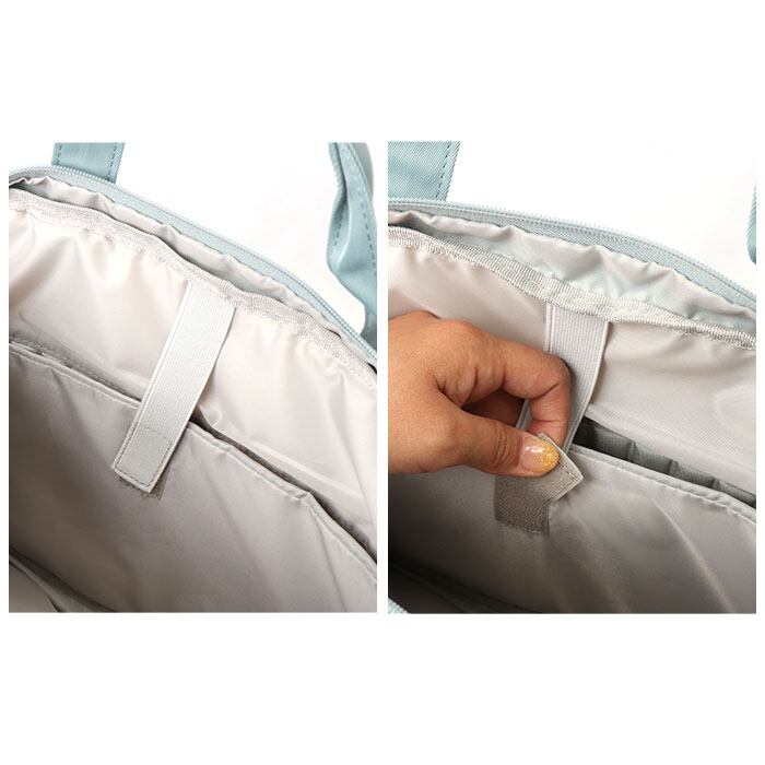 ・背面ポケット底部のファスナーを開放することで、スーツケースのキャリーハンドルにセットすることが可能。旅行のサブバッグとしても大活躍。