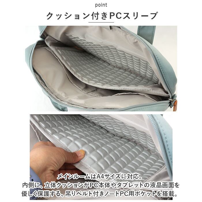 ・メインルームはA4サイズに対応。内側に、立体クッションがPC本体やタブレットの液晶画面を優しく保護する、ノートPC用ポケットを搭載。