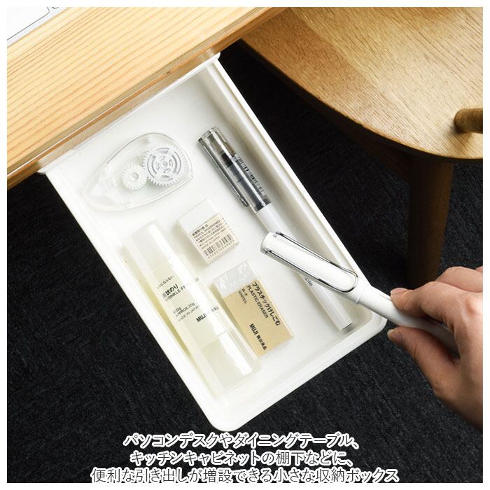 ・パソコンデスクやダイニングテーブル、キッチンキャビネットの棚下などに、便利な引き出しが増設できる小さな収納ボックス。