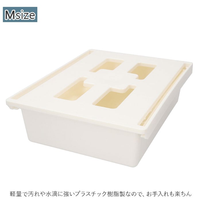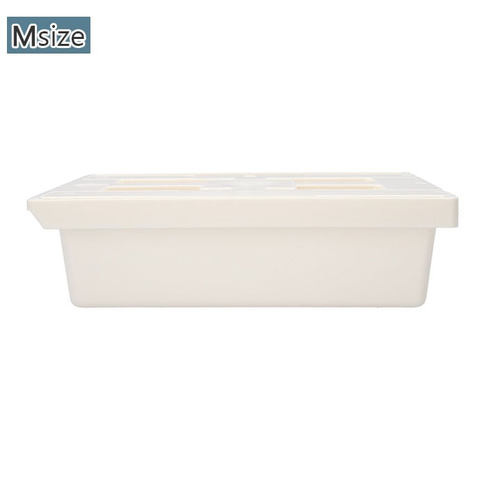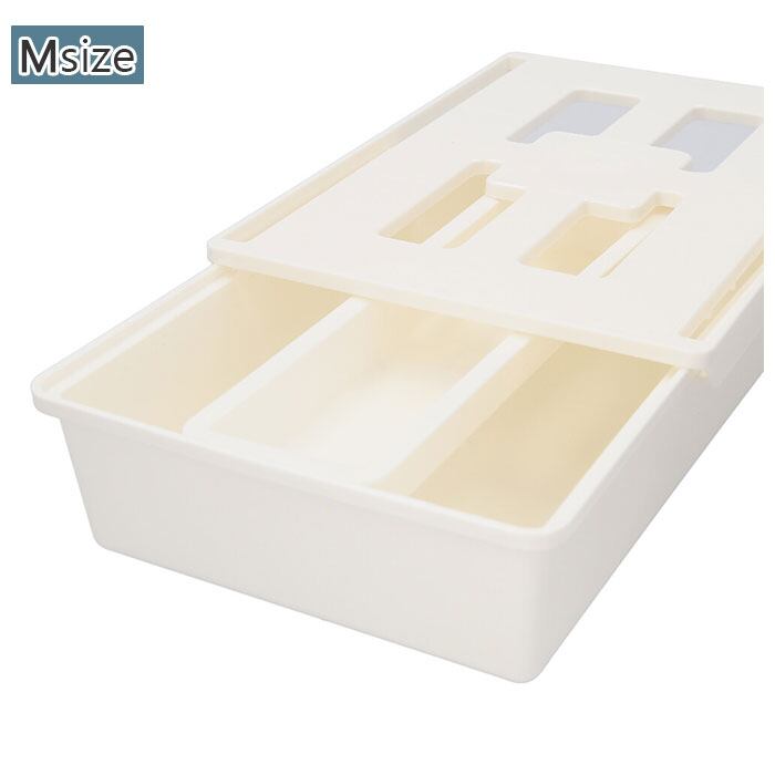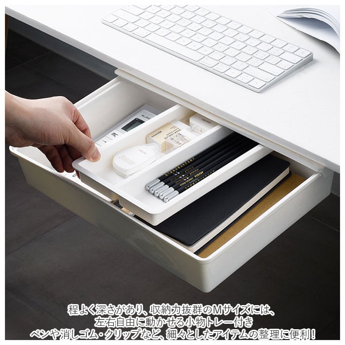 ・程よく深さがあり、収納力抜群のMサイズには、左右自由に動かせる小物トレー付き。ペンや消しゴム・クリップなど、細々としたアイテムの整理に便利!