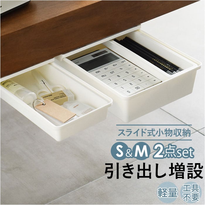 ・お仕事用デスクや収納棚の下の空きスペースを有効活用!「スライド式小物収納」にSサイズ&Mサイズの2点セットが新登場。