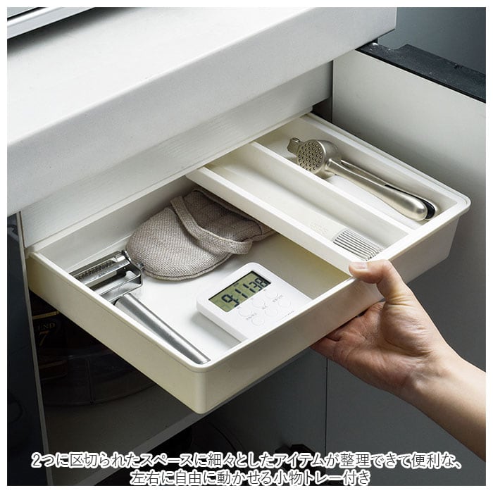 2つに区切られたスペースに細々としたアイテムが整理できて便利な、左右に自由に動かせる小物トレー付き。