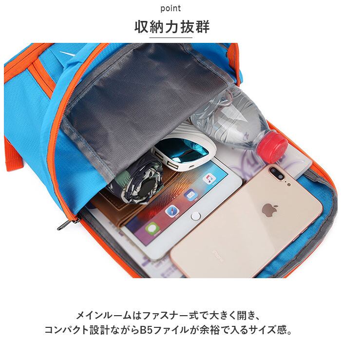 ・メインルームはファスナー式で大きく開き、コンパクト設計ながらB5ファイルが余裕で入るサイズ感。