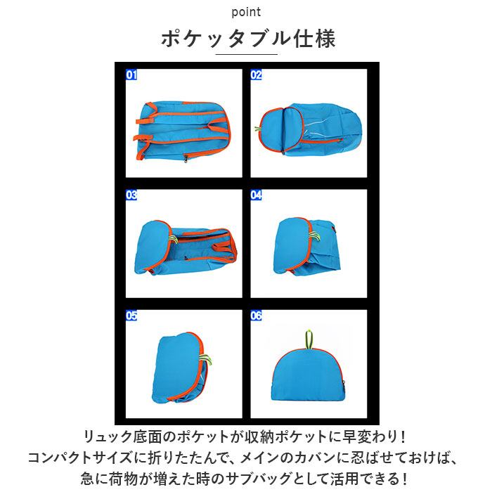 ・リュック底面のポケットが収納ポケットに早変わり!コンパクトサイズに折りたたんで、メインのカバンに忍ばせておけば、急に荷物が増えた時のサブバッグとして活用できる!