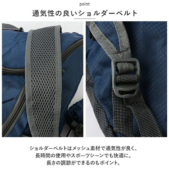 ・ショルダーベルトはメッシュ素材で通気性が良く、長時間の使用やスポーツシーンでも快適に。長さの調節ができるのもポイント。