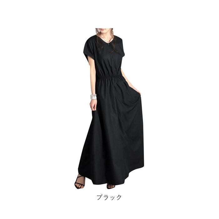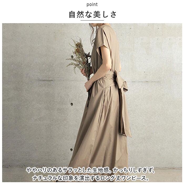 ・ややハリのあるサラッとした生地感。かっちりしすぎず、ナチュラルな印象を演出するロング丈ワンピース。