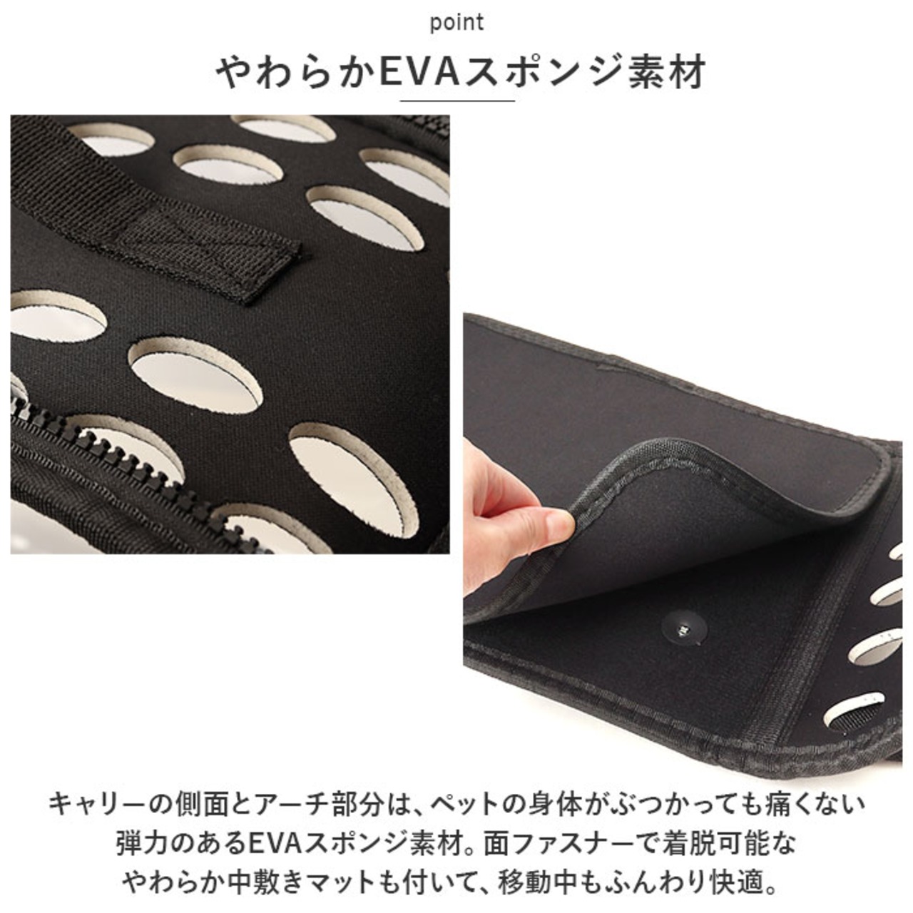 ・キャリーの側面とアーチ部分は、ペットの身体がぶつかっても痛くない弾力のあるEVAスポンジ素材。面ファスナーで着脱可能なやわらか中敷きマットも付いて、移動中もふんわり快適。