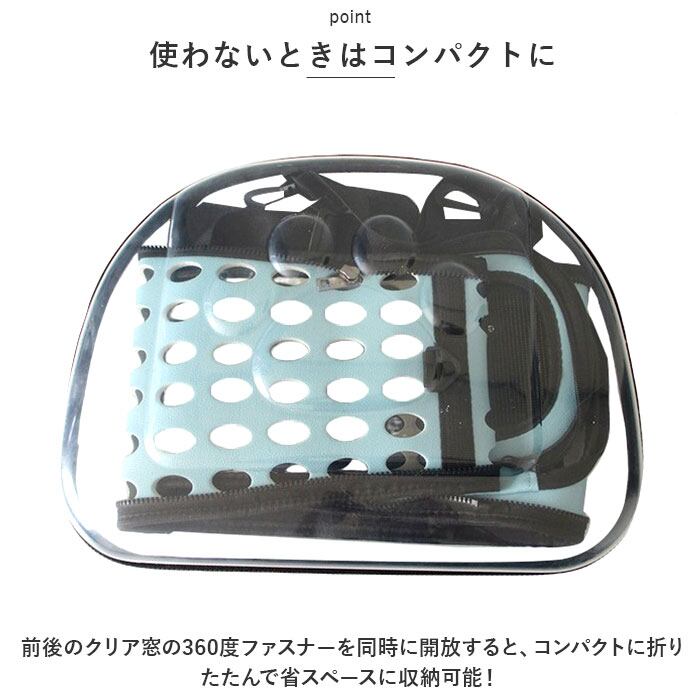 ・前後のクリア窓のフレーム部分には、ぐるっと大きく開く360度ファスナーを採用し、出入りの際のストレスフリー。キャリーバッグの苦手なコでも安心。