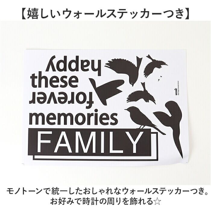 ・モノトーンで統一したおしゃれなウォールステッカーつき。お好みで時計の周りを飾れる☆