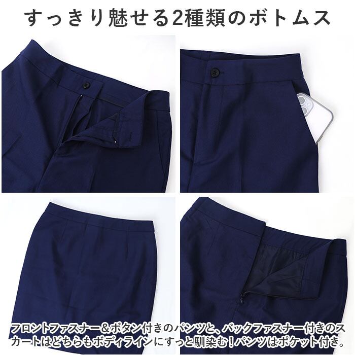 ・フロントファスナー&ボタン付きのパンツと、バックファスナー付きのスカートはどちらもボディラインにすっと馴染む!パンツはポケット付き。