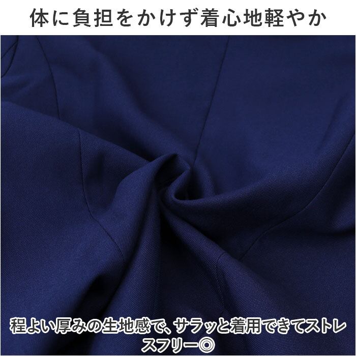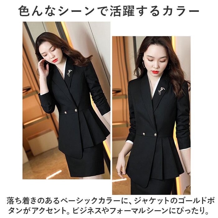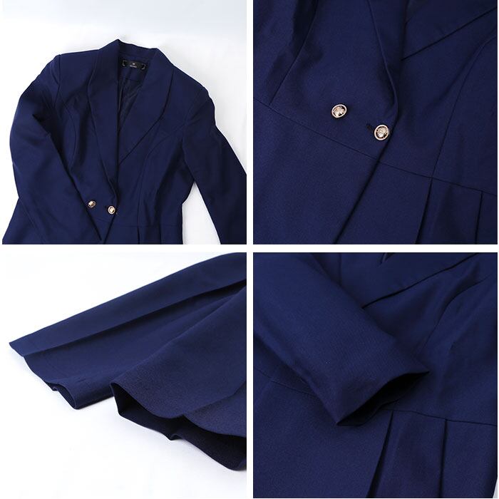 ・落ち着きのあるベーシックカラーに、ジャケットのゴールドボタンがアクセント。ビジネスやフォーマルシーンにぴったり。