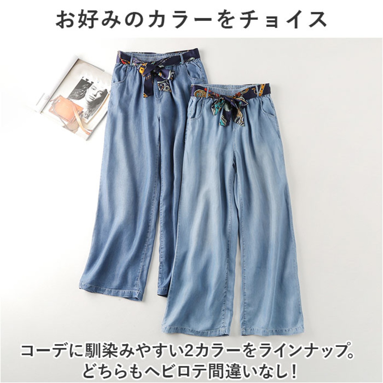 ・滑らかで柔らかな肌触りのテンセルコットン素材を使い、デニム調に仕上げたアイテム。心地よい風合いが魅力。