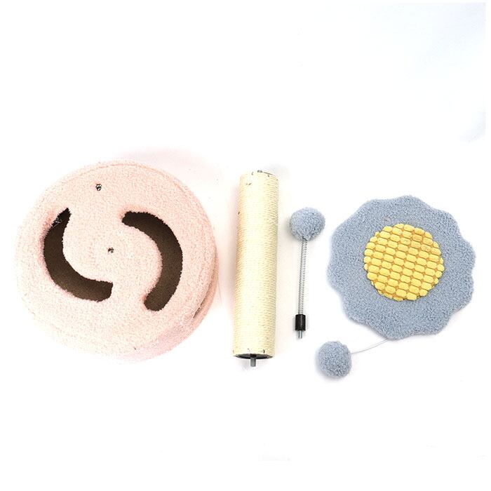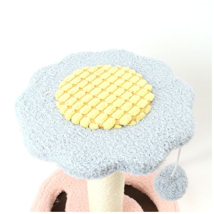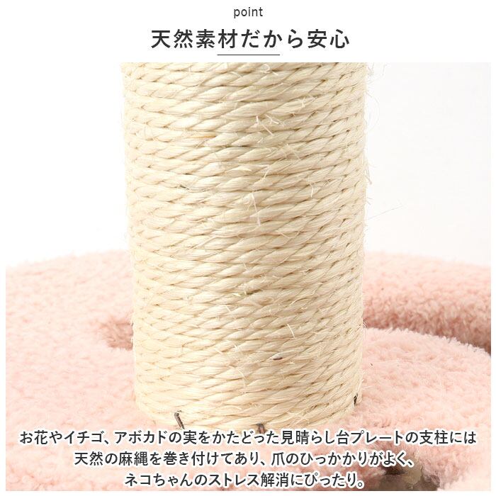 ・お花やイチゴ、アボカドの実をかたどった見晴らし台プレートの支柱には天然の麻縄を巻き付けてあり、爪のひっかかりがよく、ネコちゃんのストレス解消にぴったり。