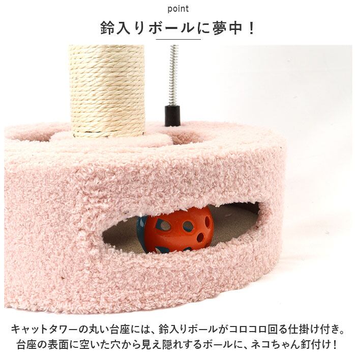 ・キャットタワーの丸い台座には、鈴入りボールがコロコロ回る仕掛け付き。台座の表面に空いた穴から見え隠れするボールに、ネコちゃん釘付け!