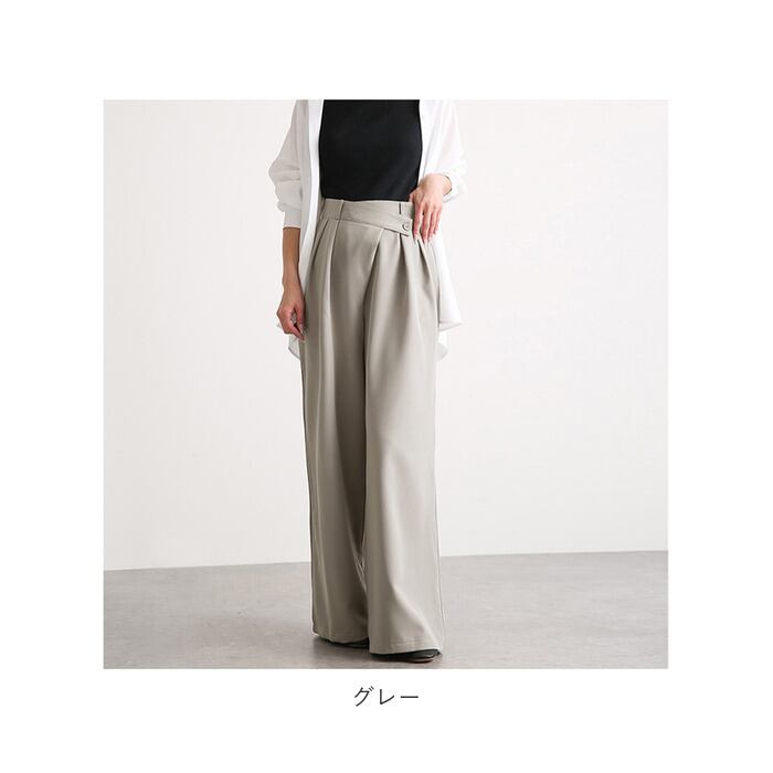 ・フロントをボタンで留める、ラップ風デザインが印象的。ボトムスをインした時の見た目もスッキリ♪(※内ボタンと合わせて、ダブルボタン仕様です。)