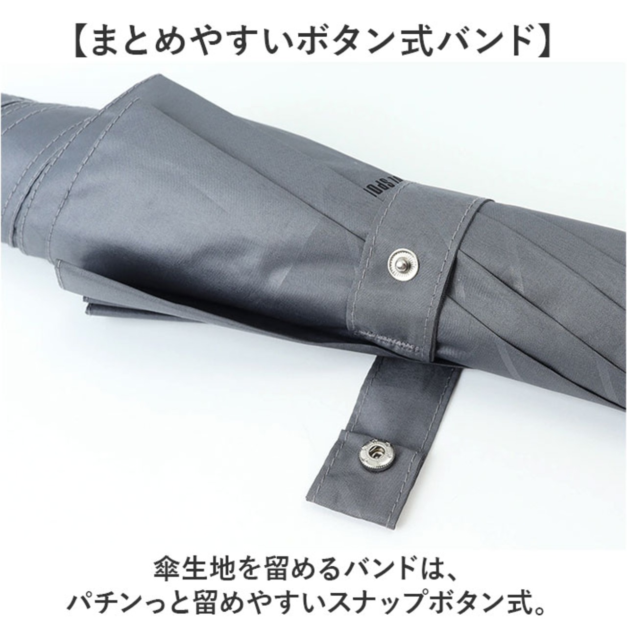 ・傘生地を留めるバンドは、パチンっと留めやすいスナップボタン式。