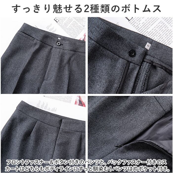 ・フロントファスナー&ボタン付きのパンツと、バックファスナー付きのスカートはどちらもボディラインにすっと馴染む!パンツは片ポケット付き。