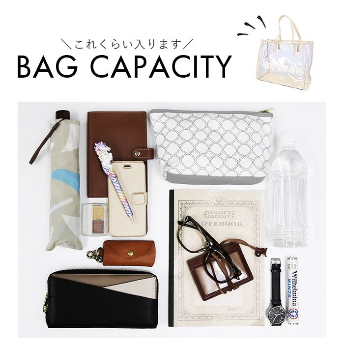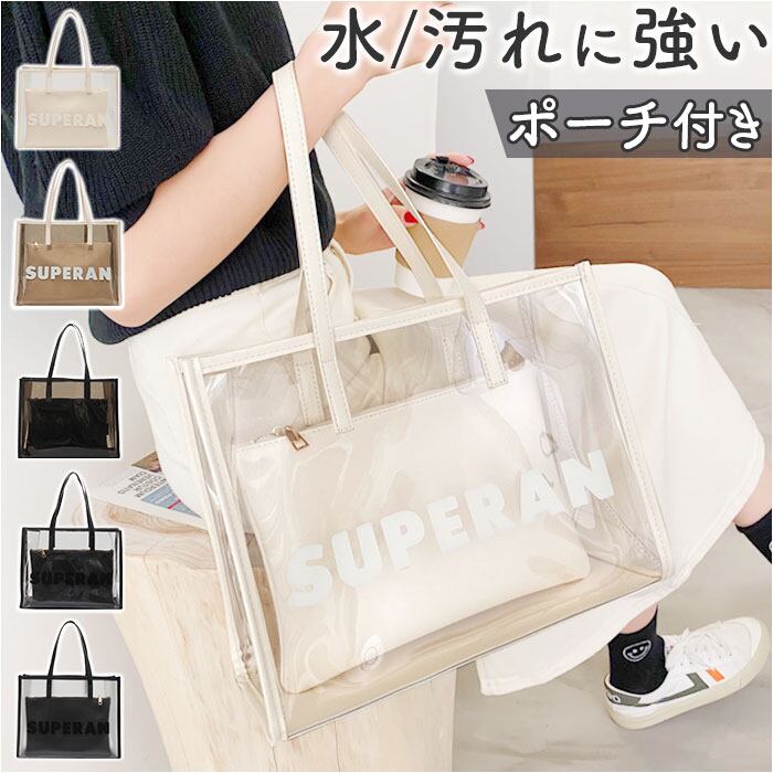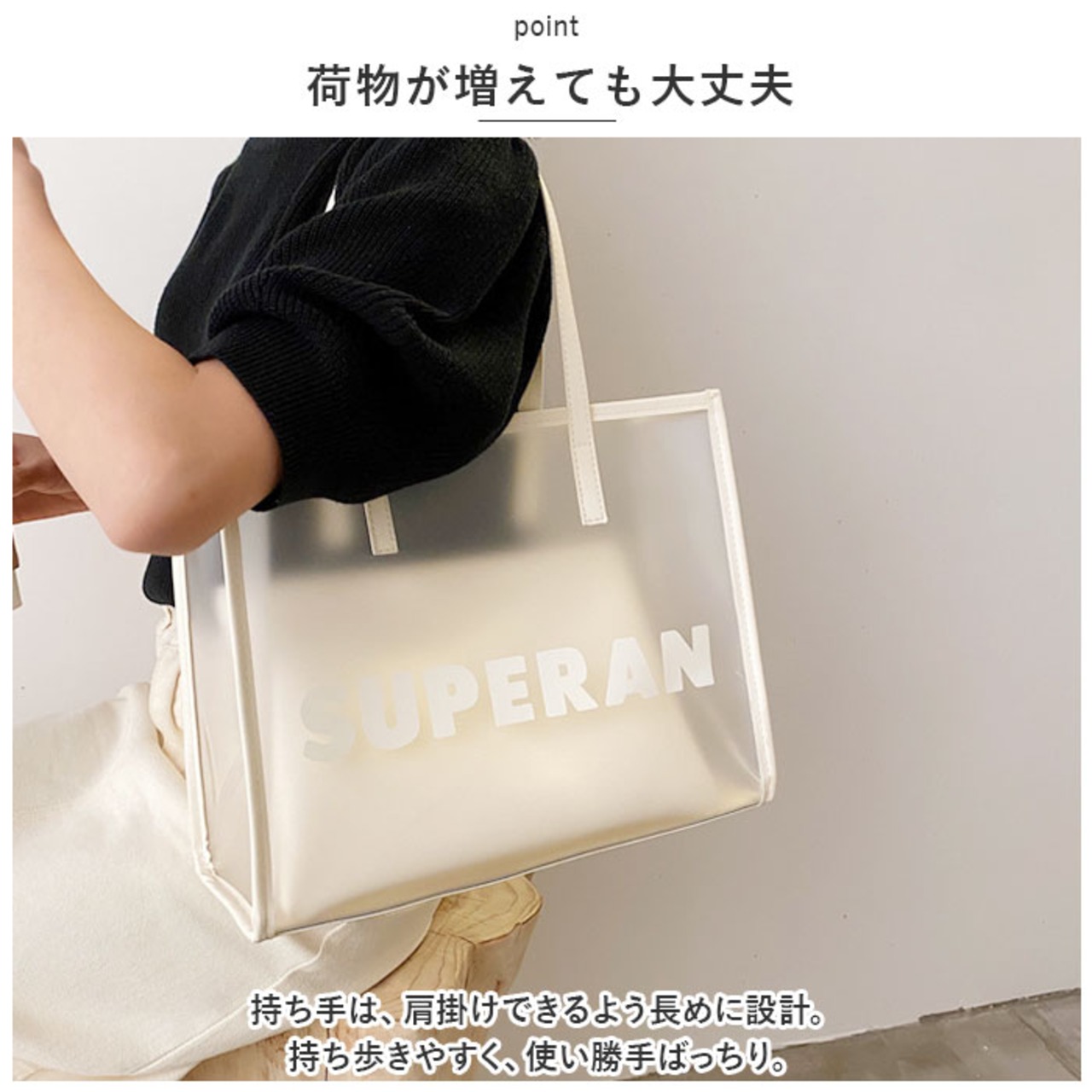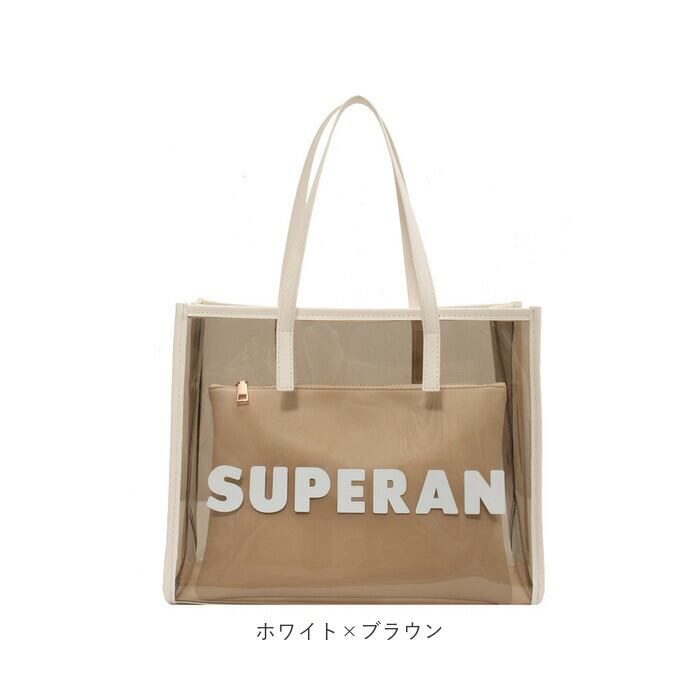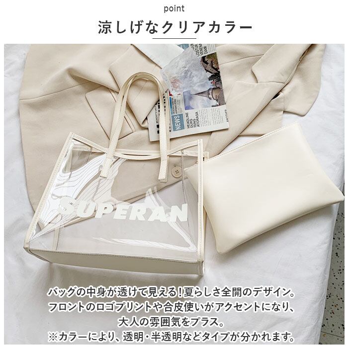 ・バッグの中身が透けて見える!夏らしさ全開のデザイン。フロントのロゴプリントや合皮使いがアクセントになり、大人の雰囲気をプラス。(※カラーにより、透明・半透明などタイプが分かれます。)