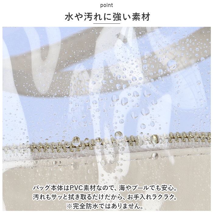 ・バッグ本体はPVC素材なので、海やプールでも安心。汚れもサッと拭き取るだけだから、お手入れラクラク。(※完全防水ではありません。)