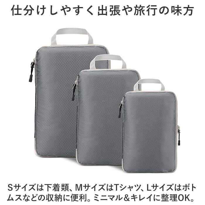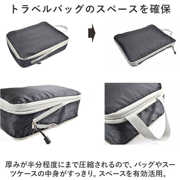・ファスナーを閉めるだけでカンタン圧縮!衣類をコンパクトに持ち運べて、パッキングをスマートに。「トラベルポーチ」3個セット。