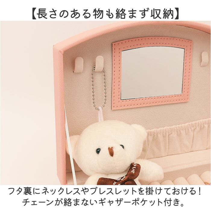 ・フタ裏にネックレスやブレスレットを掛けておける!チェーンが絡まないギャザーポケット付き。