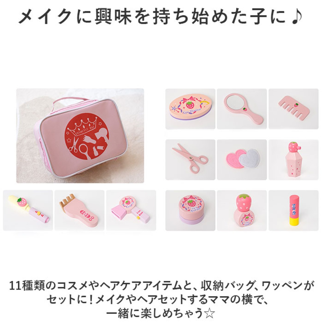 ・11種類のコスメやヘアケアアイテムと、収納バッグ、ワッペンがセットに!メイクやヘアセットするママの横で、一緒に楽しめちゃう☆