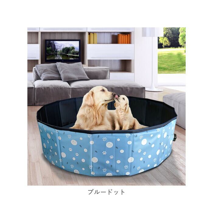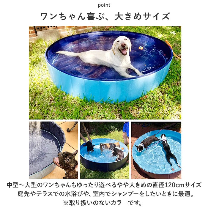 ・中型~大型のワンちゃんもゆったり遊べるやや大きめの直径120cmサイズ。庭先やテラスでの水浴びや、室内でシャンプーをしたいときに最適。