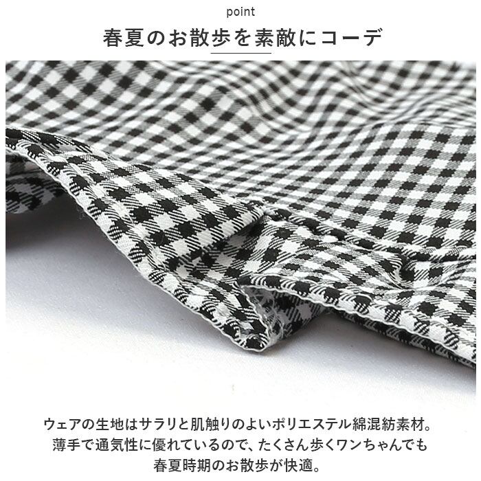 ・ウェアの生地はサラリと肌触りのよいポリエステル綿混紡素材。薄手で通気性に優れているので、たくさん歩くワンちゃんでも春夏時期のお散歩が快適。
