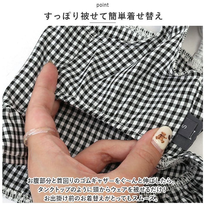 ・お腹部分と首回りのゴムギャザーをぐ~んと伸ばしたら、タンクトップのように頭からウェアを被せるだけ!お出掛け前のお着替えがとってもスムーズ。